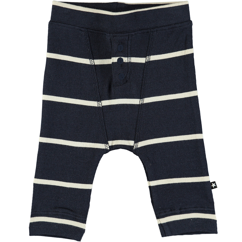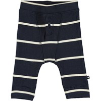 Stribede, mørkeblå baby bukser i rib med pynteknapper på fronten samt mellembred kant i talje og ved benslut.