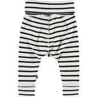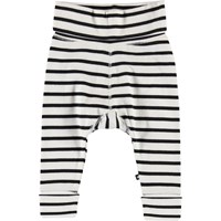 Son er et par sort og hvid stribede baby bukser. Bukserne har en bred elastisk talje og opsmøg ved benene.