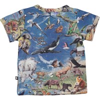 Easy er en blå baby t-shirt fremstillet i 100% økologisk bomulds jersey. T-shirten er i allover printet, Animal Earth, der viser vores jordklodes kontinenter, og alle de dyr, som lever både i vand og på land.