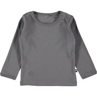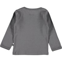 Langærmet, mørkegrå basis bluse i bomuld til baby. Trykknapper ved halsåbning gør det let at få blusen af og på.