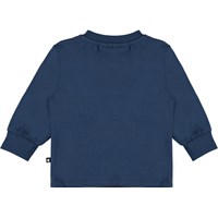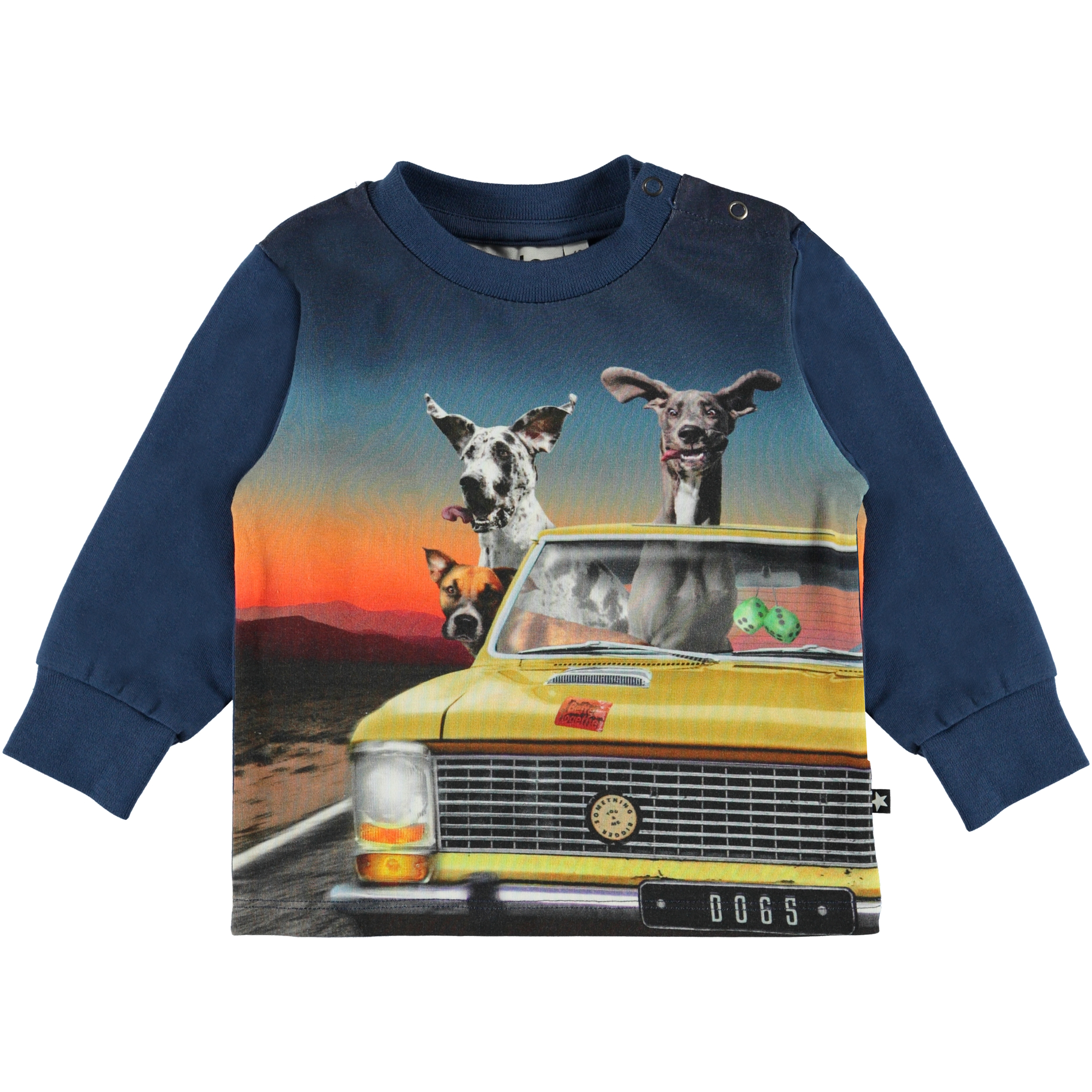 Der er fuld fart på bilen og vind i ørene på hundene på fronten af baby sweatshirten Eloy. Eloy er i blå og har knappelukning på den ene skulder.