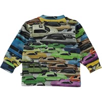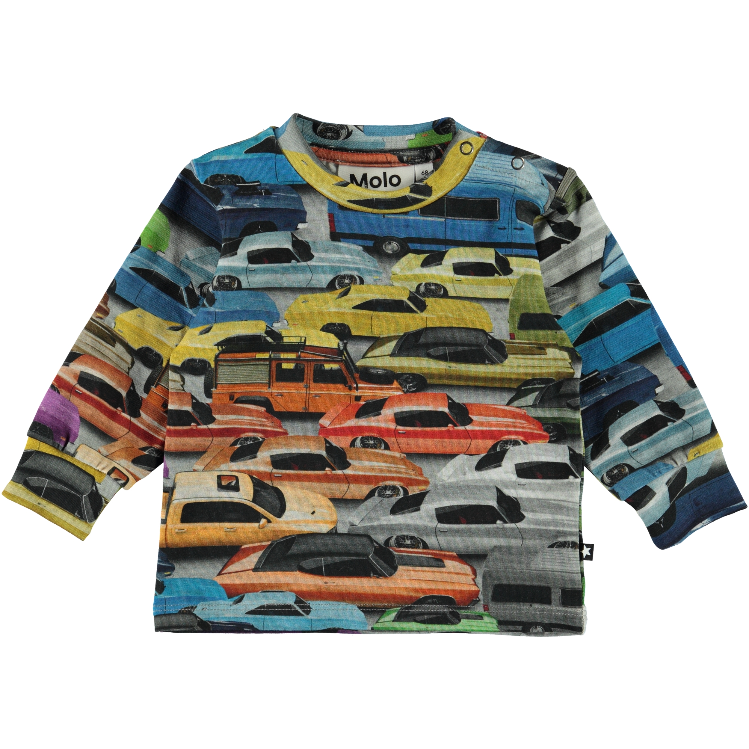 Farverige biler i massevis danner front printet her på baby sweatshirten Eloy. Sweatshirten har knappelukning på den ene skulder.