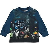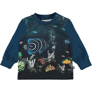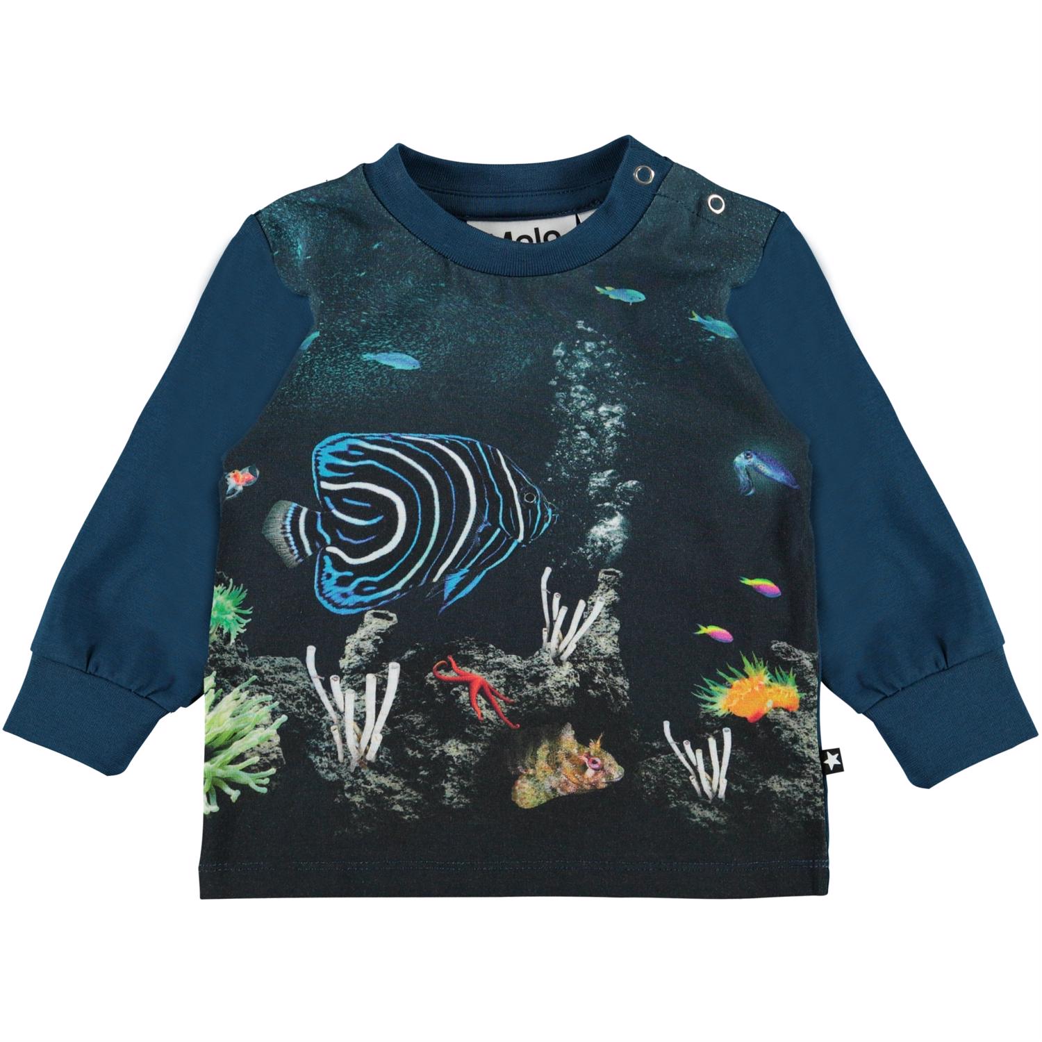 Eloy er en blå babybluse med print af de forskellige fisk under havets overflade. Eloy har knappelukning på den ene skulder, som gør den nem at få af og på.
