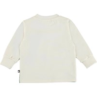 Eloy er en cremefarvet babybluse med sjovt surrealistisk print af en lille elefantunge i en æggeskal med fisk svømmende omkring sig. Eloy har knappelukning på den ene skulder, som gør den nem at få af og på. Certificeret af Ecocert Greenlife, certifikationsnummer 197496.