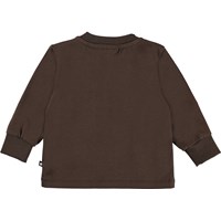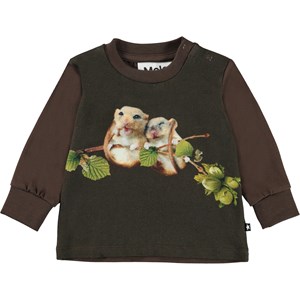 Eloy er en brun babybluse med print af små mus, som sidder på en gren med hasselnødder. Eloy har knappelukning på den ene skulder, som gør den nem at få af og på.