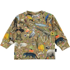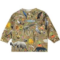 Eloy er en lysebrun babybluse i et fantastisk og detaljerigt print af surrealistiske dyr og planter. Eloy har knappelukning på den ene skulder, som gør den nem at få af og på. Certificeret af Ecocert Greenlife, certifikationsnummer 197496.