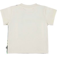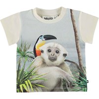 Lysegrå baby t-shirt i økologisk bomuld med print af en sød abe og en tukan på tur i junglen. Emilio har en enkelt knap i halsåbningen, som gør det nemt at få blusen af og på.