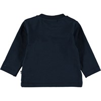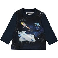 Enovan er en baby bluse med printet 'Space Scenario' på forsiden. Enovan har knappelukning på den ene skulder og mørkeblå ærmer og bagside.