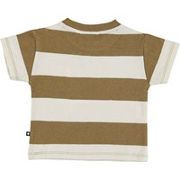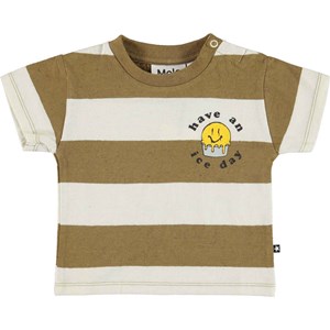 Enzo er en stribet baby t-shirt i grønbrun og knækket hvid med sødt print af en smilende is og teksten ’have an ice day’. Enzo har en enkelt knap i halsåbningen, som gør det nemt at få blusen af og på. T-shirten er blød og behagelig og lavet i bomuld/hør blanding.