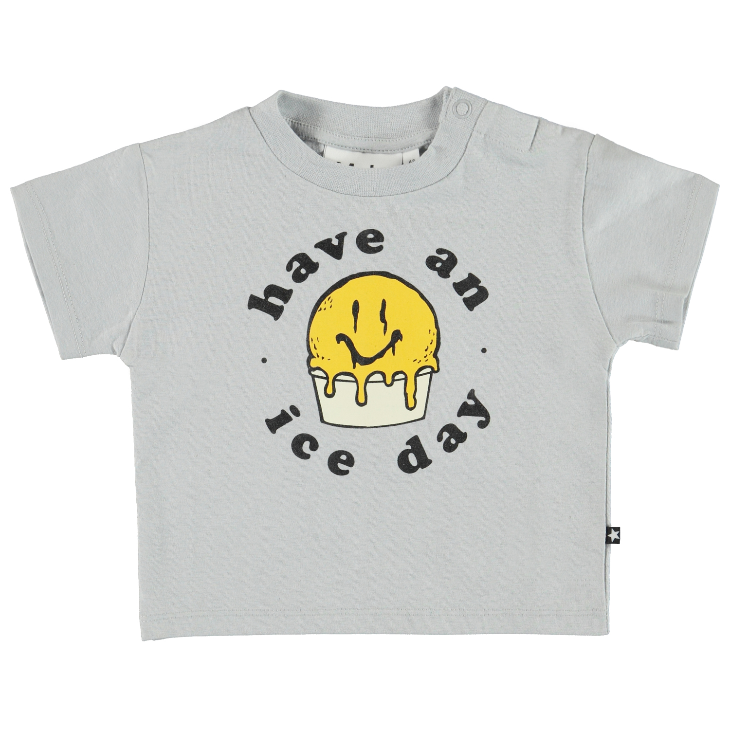Enzo er en grå baby t-shirt med sødt print af en smilende is og teksten ’have an ice day’. Enzo har en enkelt knap i halsåbningen, som gør det nemt at få blusen af og på. T-shirten er blød og behagelig og lavet i bomuld/hør blanding.