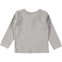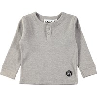 Grå baby bluse i blød rib med knapper i halsåbning og et fint, lille logo patch nederst.