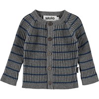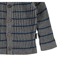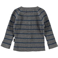 Bendix er en grå strik cardigan i rib med blå smalle striber på tværs. Cardiganen har rund hals udskæring. Kombiner Bendix med de matchende strik bukser.