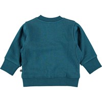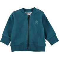 Derek er en blå/grøn baby sweatshirt med lynlås ned langs fronten. Derek har en blød, børstet inderside, samt rib ved hals, ærmeafslutning og bund og broderet stjerne på brystet.