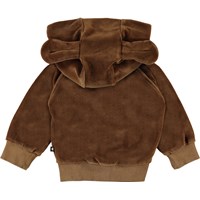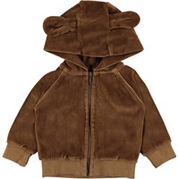 Dirk er en brun velour sweatshirt med hætte, som har påsyede lange ører. Dirk har lynlås ned langs fronten, samt rib ved hals, ærmeafslutning og bund. Kombiner hættetrøjen med matchende bukser.