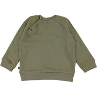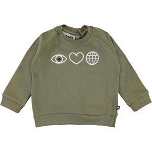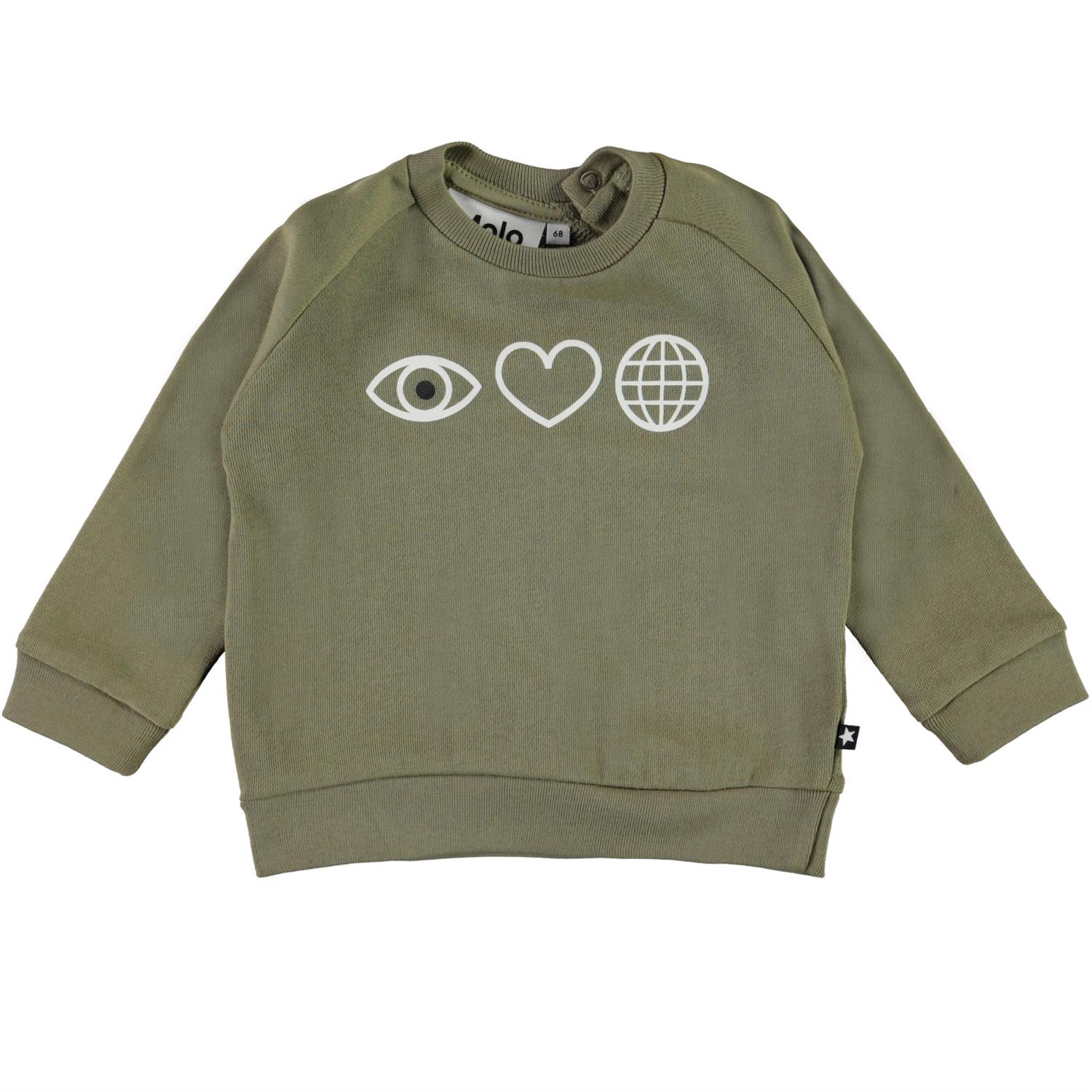 Disco er en baby sweatshirt i khaki grøn med print af et øje, hjerte og jordklode på fronten. Sweatshirten knappes i nakkes bagpå. Certificeret af Ecocert Greenlife, certifikationsnr. 197496.