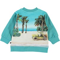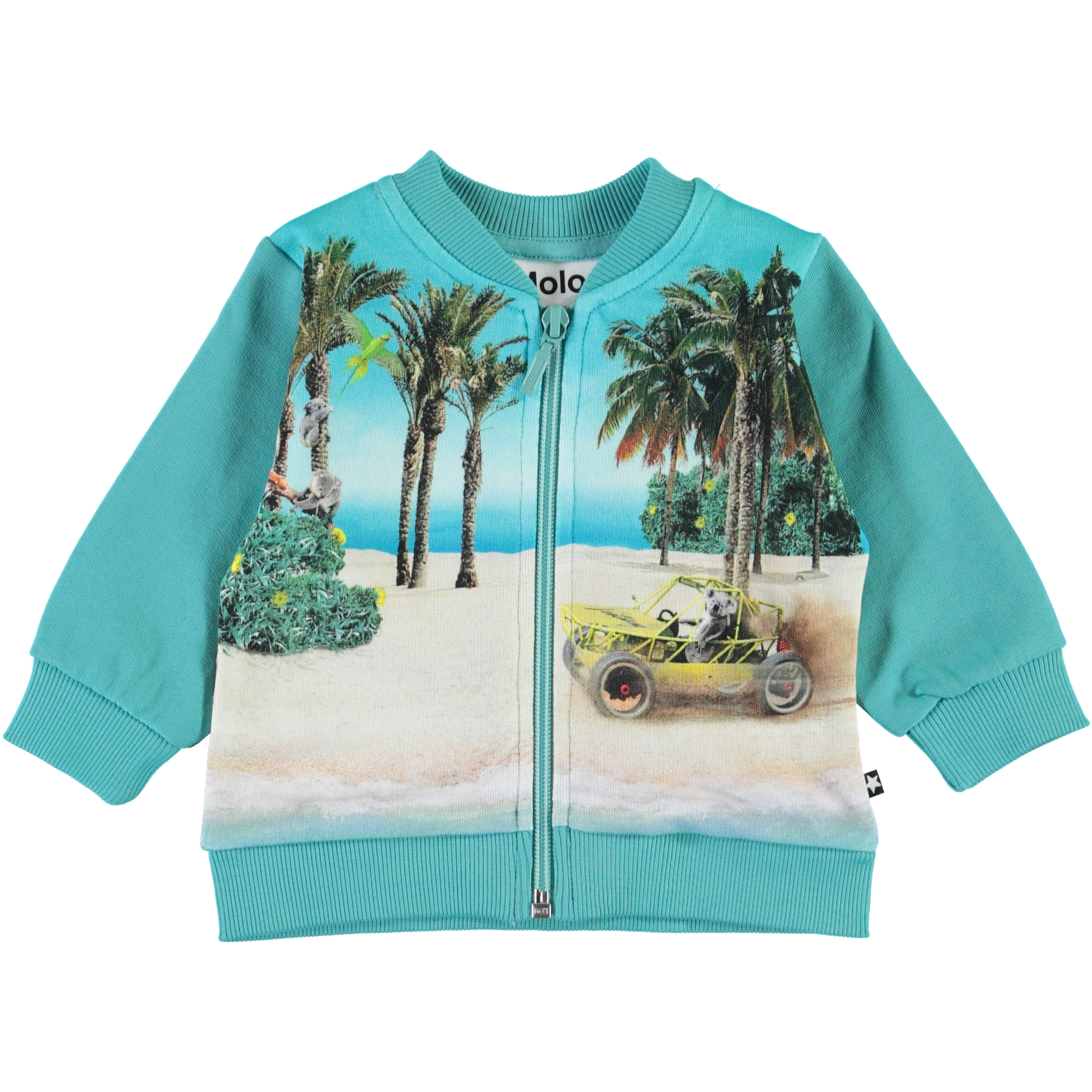 Duff er baby sweatshirt i turkis med print af strand, palmer og koala bjørne. Duff har lynlås ned langs fronten, samt rib ved hals, ærmeafslutning og bund. Kombiner sweatshirten med matchende bukser.