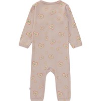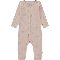 Lyserød babydragt med hjerte print. Dragten har lange ærmer, lange ben og trykknapper ned gennem fronten.