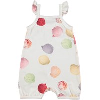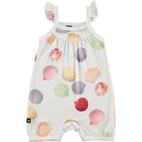 Sød kortbenet dragt med tynde stopper, flæsedetaljer omkring skuldrene samt digitalprintede iskugler. Åbnes og lukkes let med trykknapper mellem benene.