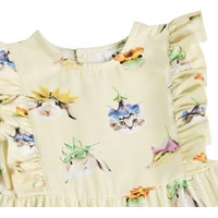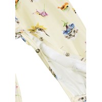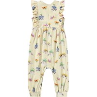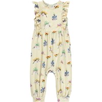 Heldragt i gul med dyreprint, i økologisk bomuld til de mindste. Ærmeløs, med fine flæsedetaljer, lange ben med ribkant og rummelig pasform for optimal bevægelsesfrihed. Lukkes nemt med knapper i ryggen og mellem benene.