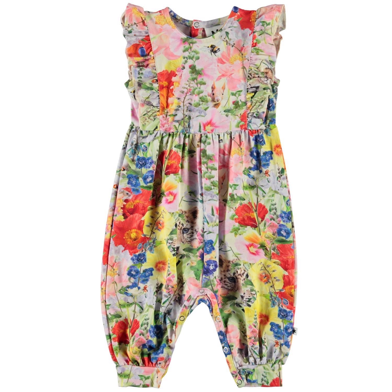Fallon er en baby dragt uden ærmer med flæsekant på skuldrene. Dragten er med blomster print, hvor man kan finde forskellige dyr, som gemmer sig imellem blomsterne. Trykknapper i nakken og mellem benene gør det nemt at få dragten af og på. Certificeret af Ecocert Greenlife, certifikationsnr. 197496.