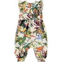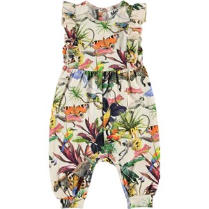 Fallon er en baby dragt uden ærmer med flæsekant på skuldrene. Dragten er lavet i et fint print med smukt farverig fantasi jungle. Trykknapper i nakken og mellem benene gør det nemt at få dragten af og på.