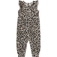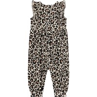 Heldragt i blød økologisk bomuld til de mindste. Dragten er uden ærmer og har en sød flæsekant foran og bagpå. Knaplukningen i nakken og mellem benene gør den nem at få af og på. Dragten har et allover jaguarprint.