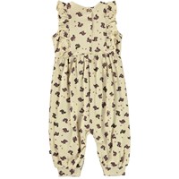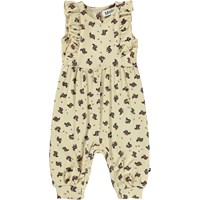 Fallon er en babydragt uden ærmer med flæsekant på skuldrene. Her er dragten i lysegul med print af små egern. Trykknapper i nakken og mellem benene gør det nemt at få dragten af og på.
