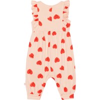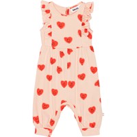 "Lyserød baby dragt med sød flæsekant for- og bagpå i blødt økologisk bomuld. Dragten er uden ærmer, ribkant i benene samt trykknapper i nakken og mellem benene der gør den er nem at få af og på. Dragten har et alloverprint af søde graffiti hjerter med smilende ansigter.