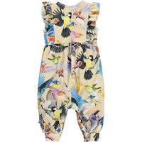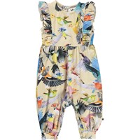 Fallon er en babydragt uden ærmer med flæsekant på skuldrene. Her er dragten i lysegul med print af forskellige fugle. Trykknapper i nakken og mellem benene gør det nemt at få dragten af og på.