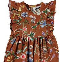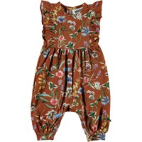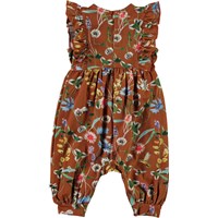 Fallon er en baby dragt uden ærmer med flæsekant på skuldrene. Dragten er i brun med print af vilde blomster og insekter. Trykknapper i nakken og mellem benene gør det nemt at få dragten af og på.