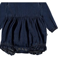 Fawn er babydragt i mørkeblå denim med lange ærmer og uden ben. Dragten har lille flæsekant på skuldre og ved benafslutning. Trykknapper i nakken og mellem benene gør det nemt at få dragten af og på.