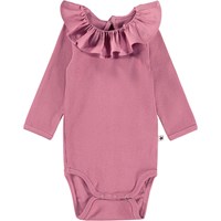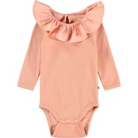 Cremefarvet langærmet body i ribbet økologisk bomuld til de mindste. Bodyen har en sød poplinkrave, knaplukning i ryggen og trykknapper mellem benene for nem påklædning.