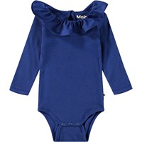 Pudderfarvet langærmet body lavet af ribbet økologisk bomuld. Bodyen har en sød poplin krave, knaplukning i ryggen og trykknapper mellem benene for nem påklædning.
