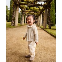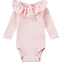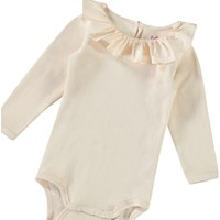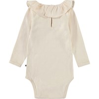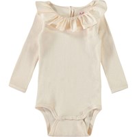 Beige langærmet body i ribbet økologisk bomuld til de mindste. Bodyen har en sød poplinkrave, knaplukning i ryggen og trykknapper mellem benene for nem påklædning.
