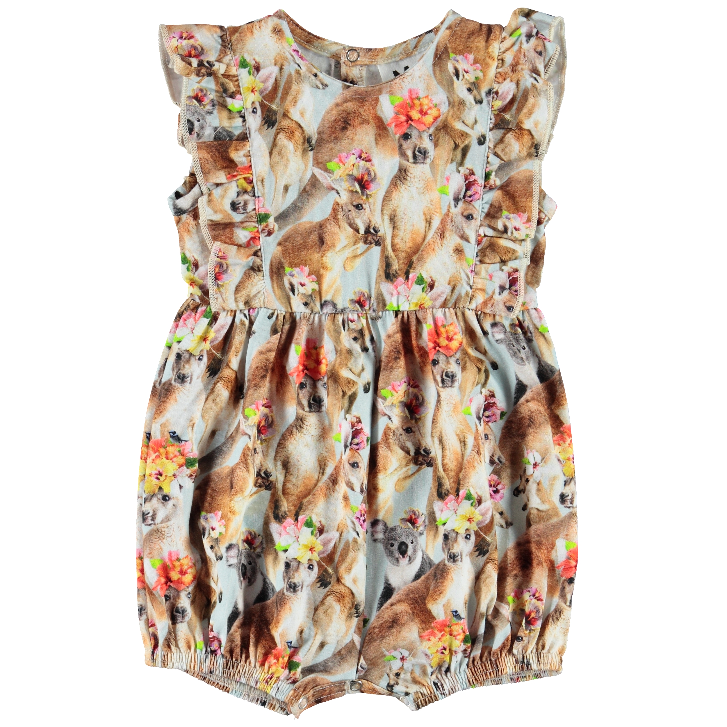 Felicia er en baby dragt med print af kænguruer med blomster på hovedet. Dragten har flæsekanter ved ærme gabene, samt trykknapper i nakken og mellem benene, som gør det nem at få dragten af og på.