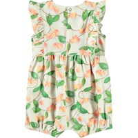 Heldragt i økologisk bomuld til de mindste. Heldragten er uden ærmer, med fin flæsekant foran og bagpå samt korte ben med elastik. Knaplukningen i ryggen og mellem benene gør den nem at få af og på. Dragten har en rummelig pasform med masser af plads til bevægelse. Dragten har print af kirsebær.