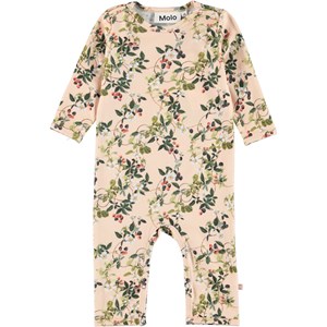 Fenez er en babydragt med lange ben og ærmer. Dragten er i rosa med print af brombærranker. Trykknapper ved hals og ben gør det let at få bodyen af og på.