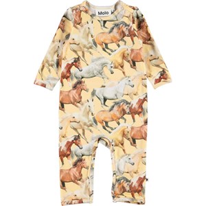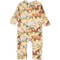 Fenez er en babydragt med lange ben og ærmer og hesteprint på gul baggrund. Trykknapper ved hals og ben gør det let at få dragten af og på.
