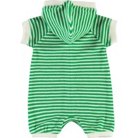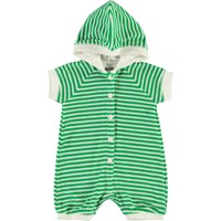 Fidelia er en grøn og hvidstribet babydragt med korte ben og ærmer samt hætte. Dragten er lavet i blød frotté og har fine hvide knappen foran.
