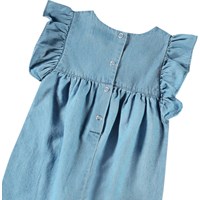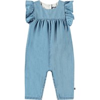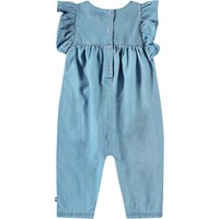 Lyseblå heldragt i økologisk bomulds chambrey. Dragten har lange ben og små flæseærmer samt knaplukning bagpå og mellem benene, hvilket gør den nem at tage af og på.