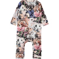 Fiona er en baby heldragt i med print af små hunde med sløjfe om halsen. Trykknapper ved hals og mellem ben gør det let at få dragten af og på. Certificeret af Ecocert Greenlife, certifikationsnr. 197496.