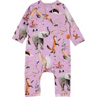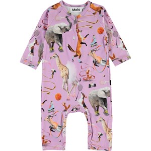 Fiona er en baby heldragt i lilla med print af dyr som dyrker sport. Trykknapper ved hals og mellem ben gør det let at få dragten af og på.