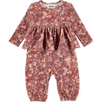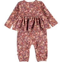 Flavia er en rød baby dragt med print af blomster. Dragten har lange ærmer og ben, samt peplum skørt i taljen. Trykknapper på skuldrene og mellem benene gør det nemt at få dragten af og på.