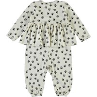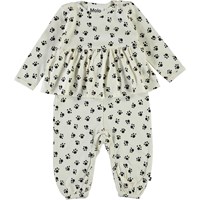 Flavia er en hvid baby dragt med print af sorte pote aftryk. Dragten har lange ærmer og ben, samt peplum skørt i taljen. Trykknapper på skuldrene og mellem benene gør det nemt at få dragten af og på. Certificeret af Ecocert Greenlife, certifikationsnr. 197496.