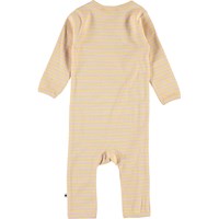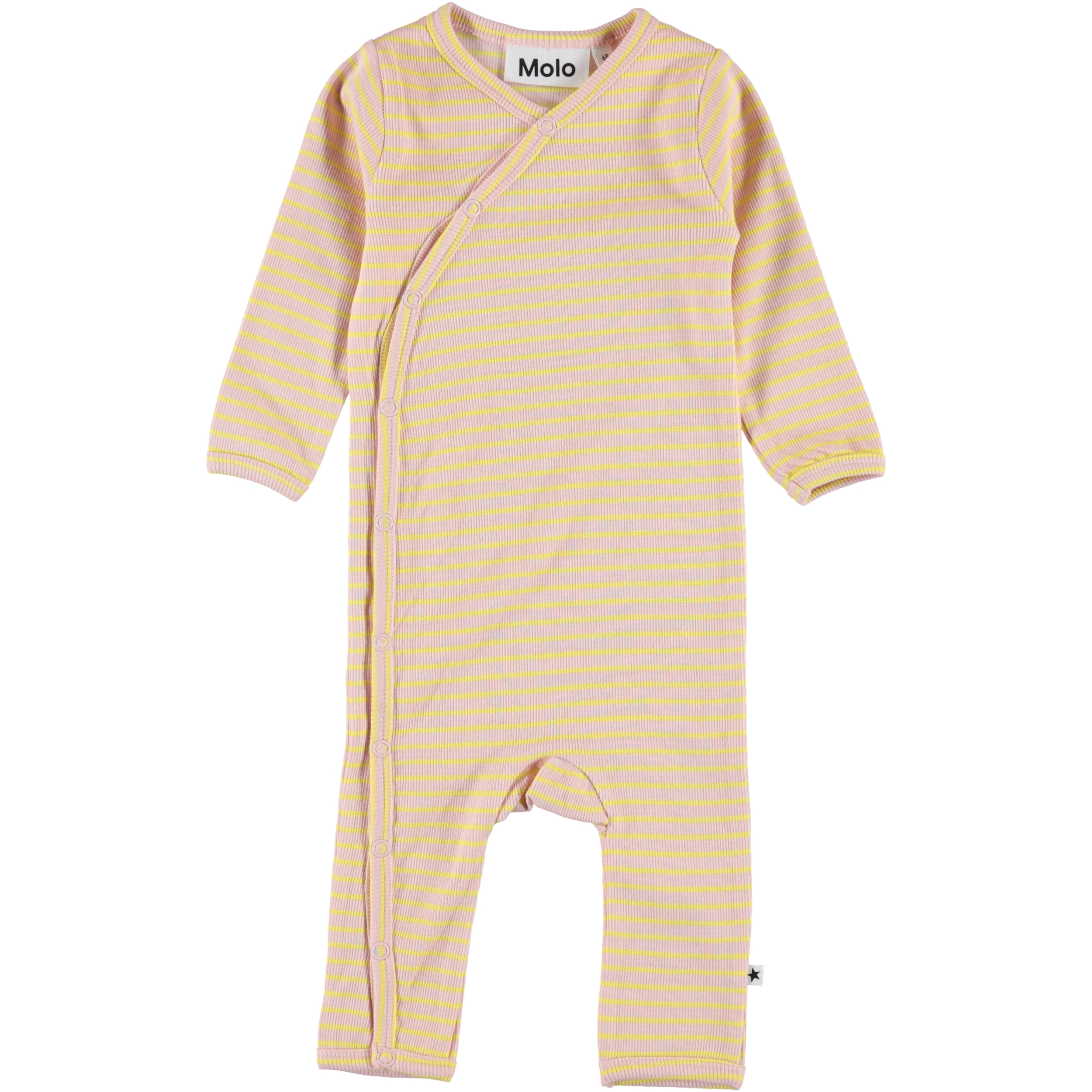 Flora er en baby heldragt med lange ærmer og ben i lyserød rib med gule striber. Dragten har skrå lukning over fronten med trykknapper, samt trykknapper mellem benene, som gør det nemt at få dragten af og på.