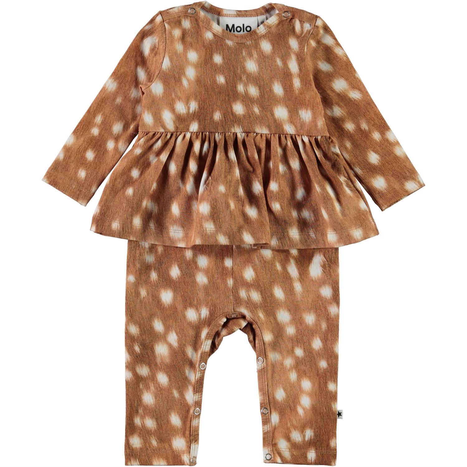 Florie er en baby dragt med lange ærmer og ben, samt peplum skørt på midten. Dragten er i brun med print af hvide pletter. Trykknapper på skuldre og mellem benene gør det nemt at få dragten af og på.