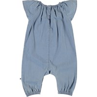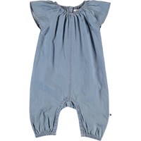 Florina er en baby dragt med fin volumen i denim og med korte ærmer. Dragten har trykknapper i nakken og mellem benene, som gør det nem at få dragten af og på.