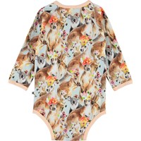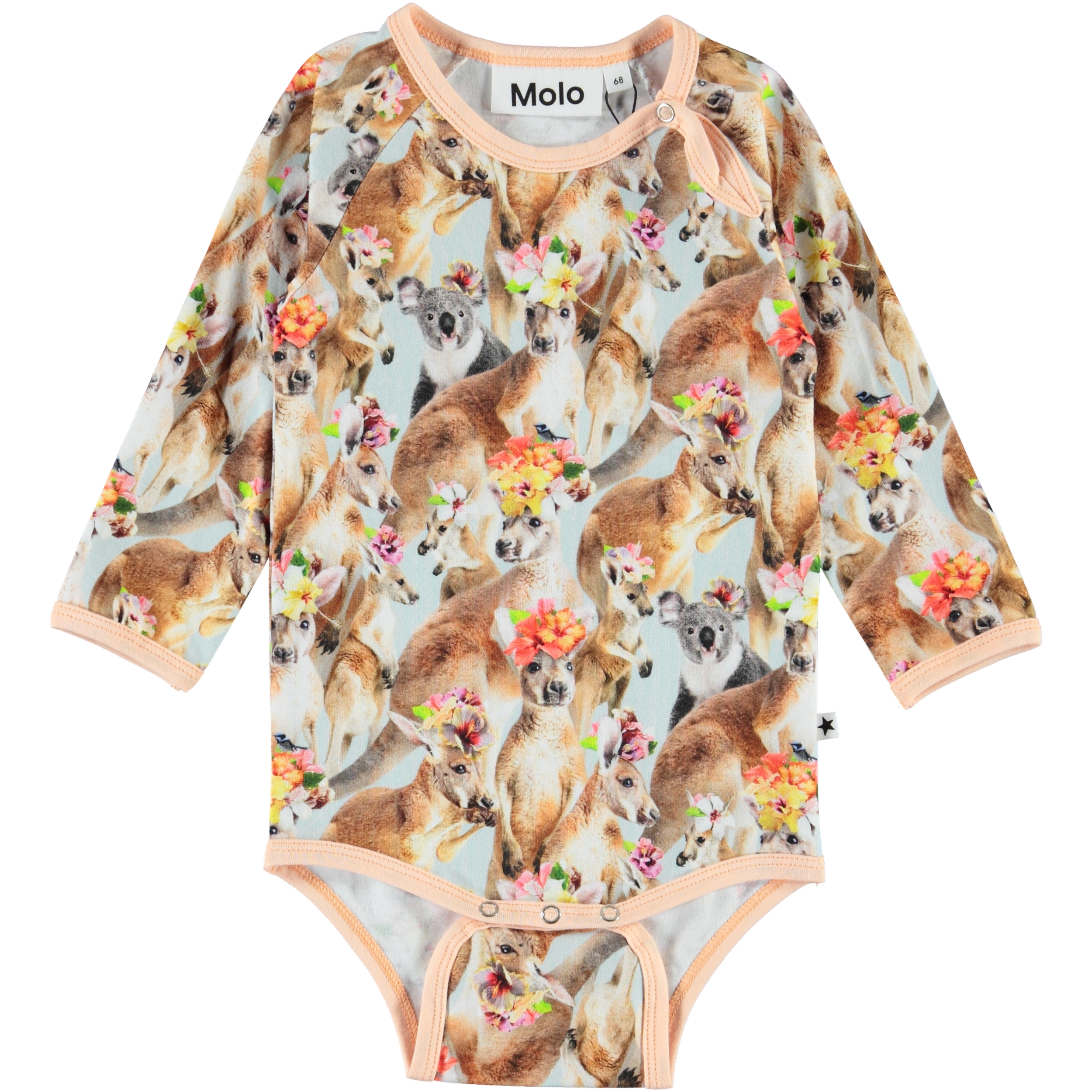 Fonda er en langærmet baby body med all-over print af kænguruer med blomster på hovedet. Fonda har koral farvede kantebånd og trykknap i kraven og mellem benene, som gør det nemt at få bodyen af og på.