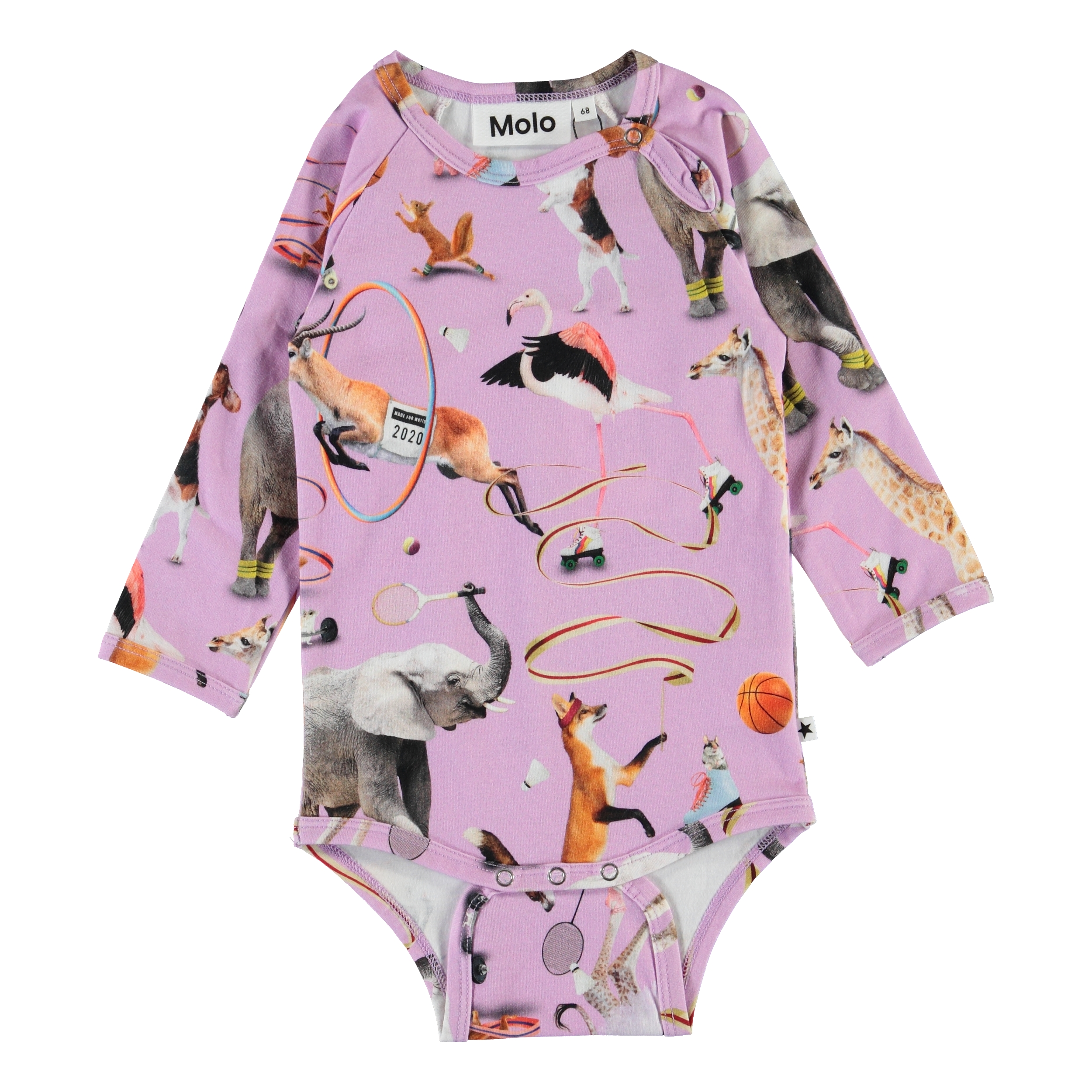 Fonda er en baby body med lange ærmer i lilla med print af dyr som dyrker sport. Fonda har trykknap i kraven og mellem benene, som gør det nemt at få bodyen af og på.
