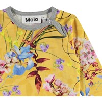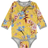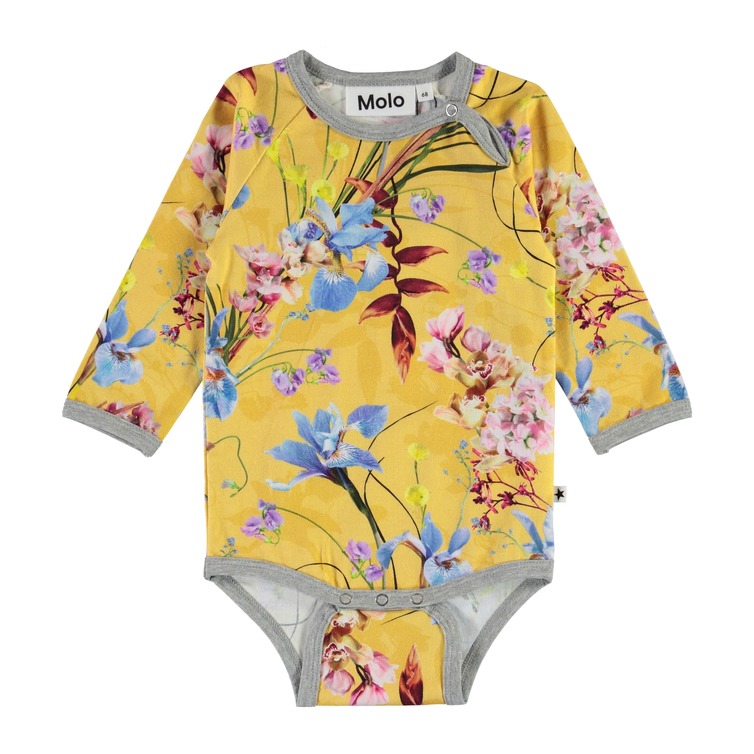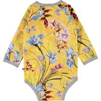 Fonda er en baby body med lange ærmer i gul med blomster print og grå kantebånd. Fonda har trykknap i kraven og mellem benene, som gør det nemt at få bodyen af og på.